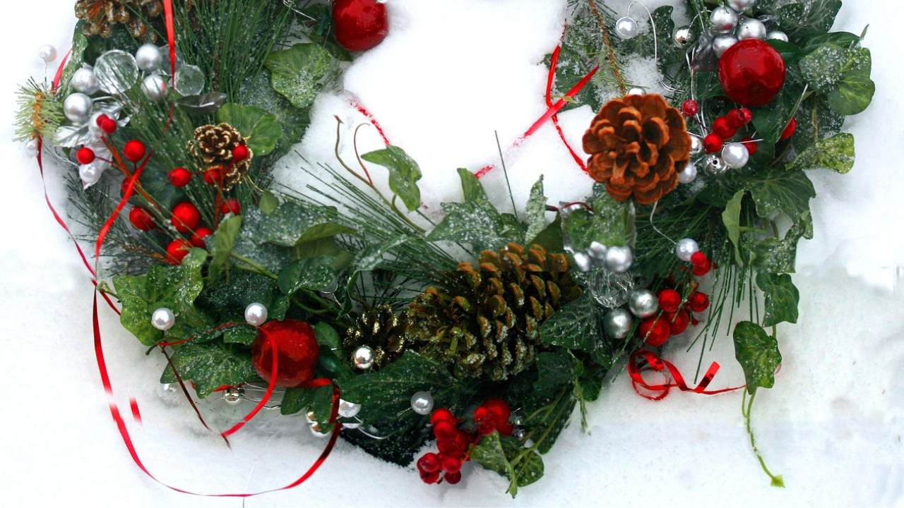 Create a loose festive wreaths with baubles, ribbons, and visual texture.